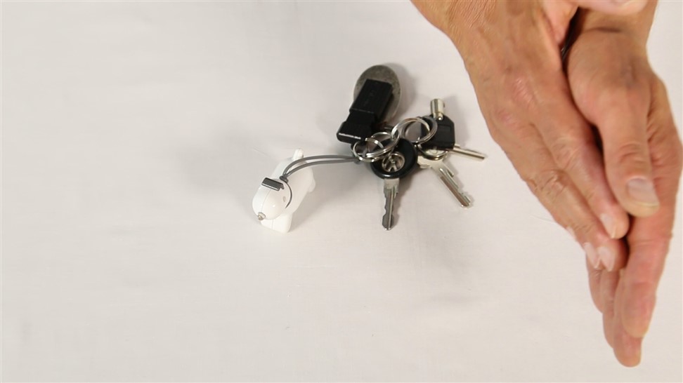 Schlüsselfinder DOGGY: mit Hundegebell und Blinklicht – wird durch Klatschen in die Hände aktiviert – mit gummierter Leine zum Befestigen am Schlüsselbund, Batterie: 3 x AG13/ LR44 (inkl.)