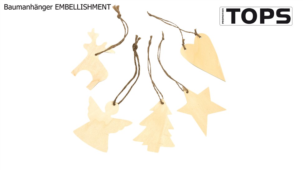 aus Holz, weihnachtliche Motive (Stern, Engel, Tanne, Rentier, Herz) mit Aufhängeband, 5-fach sortiert, im OPP-Beutel mit rotem Einleger