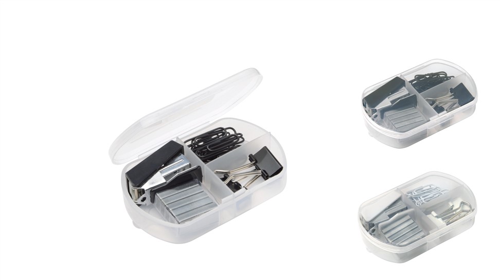 consists of stapler, 20 paper clips, 2 document clips, 500 staples, in a useful container box