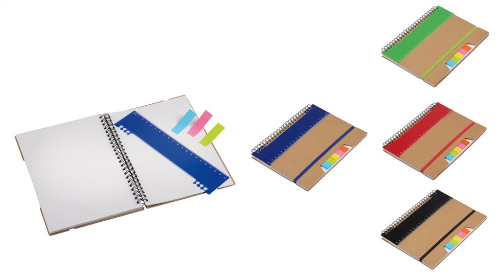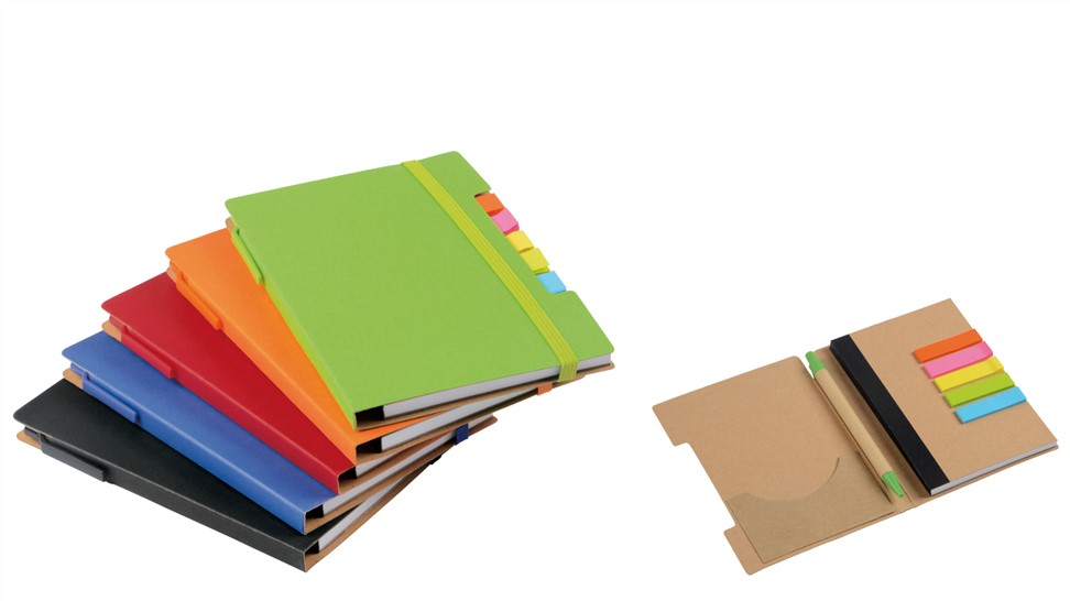 in a handy size with rounded corners, incl. ballpoint pen made out of cardboard (black ink), elastic strap in matching colour, 70 pages, 70g/m², 5 differently coloured self-adhesive labels – made of recyclable materials