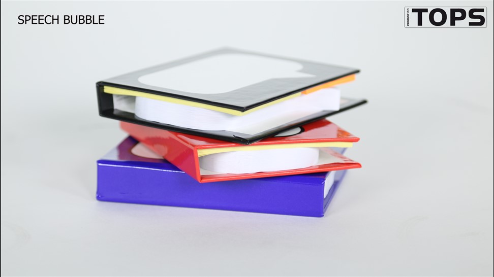 in book-shape: white adhesive memo pad (approx. 100 sheets) shaped like a speech bubble, page markers in various colours and yellow sticky notes