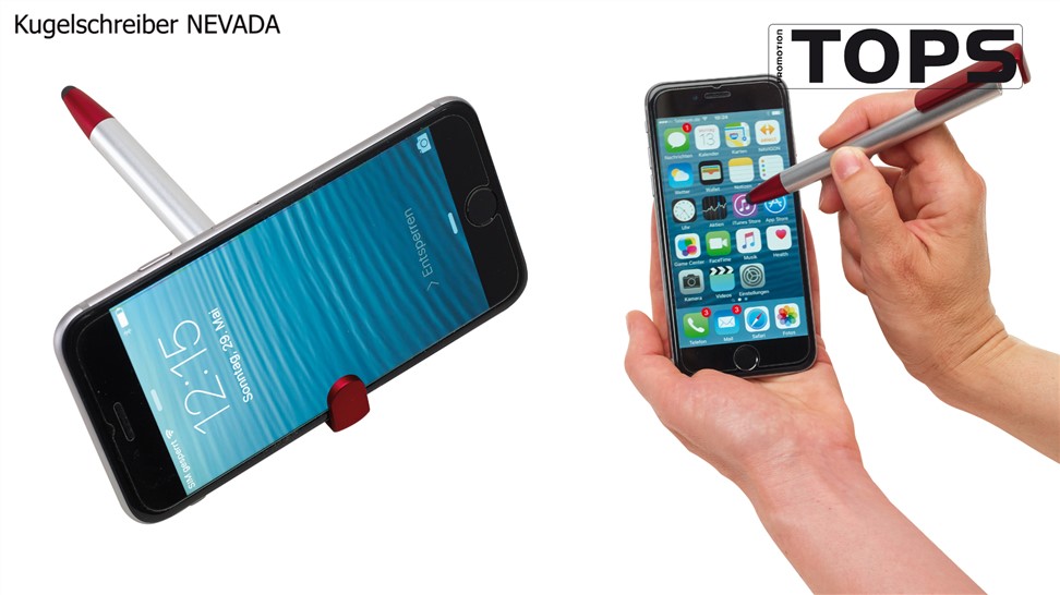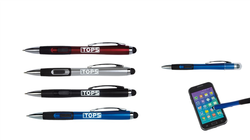 with press mechanism and touchscreen tip to navigate smartphones, wide clip serves as telephone holder, blue ink