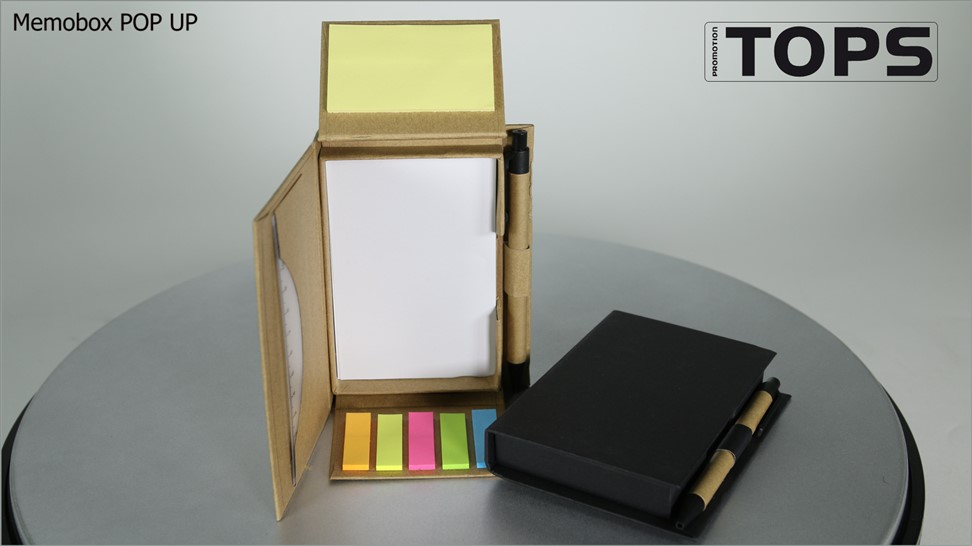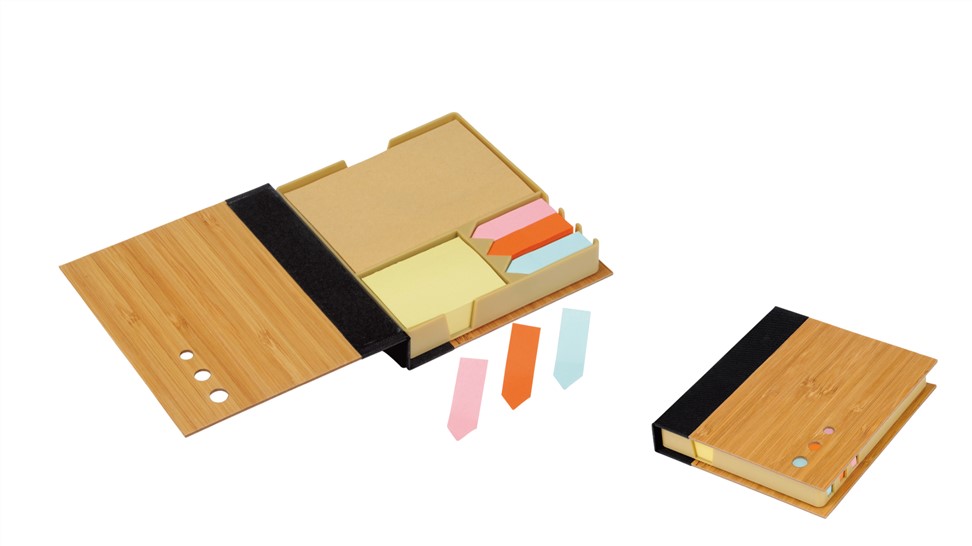 with arrow-shaped labels in 3 colours and 2 adhesive memo pads in different colours, 150 sheets each, in a bamboo case made of recyclable materials