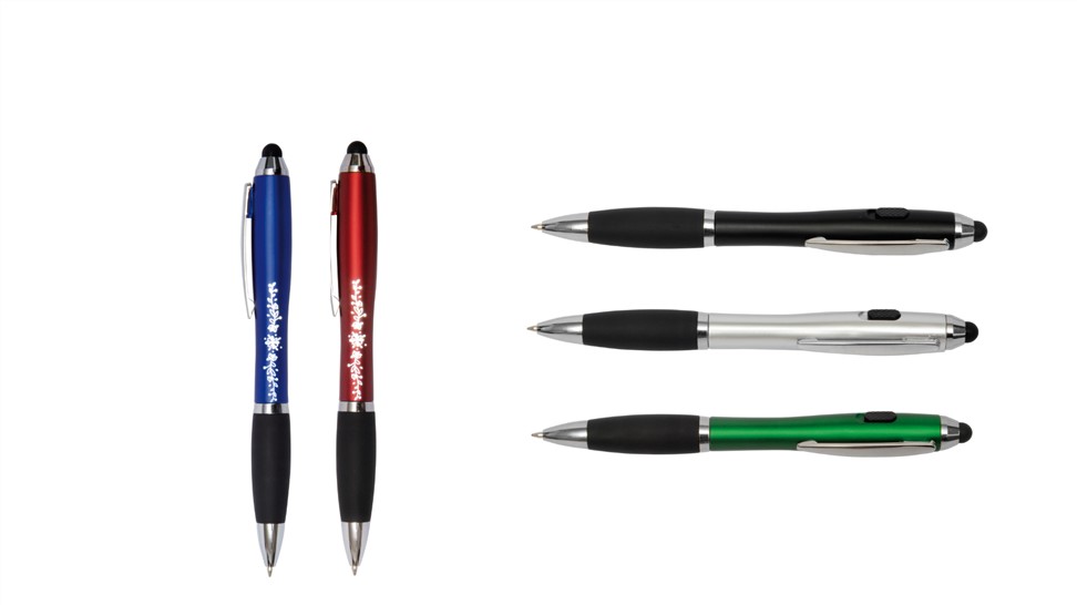 with twist mechanism, incl. white LED light to illuminate laser engraving, with touchscreen tip for smartphones and tablets, with on/off switch for the LED light, with blue ink