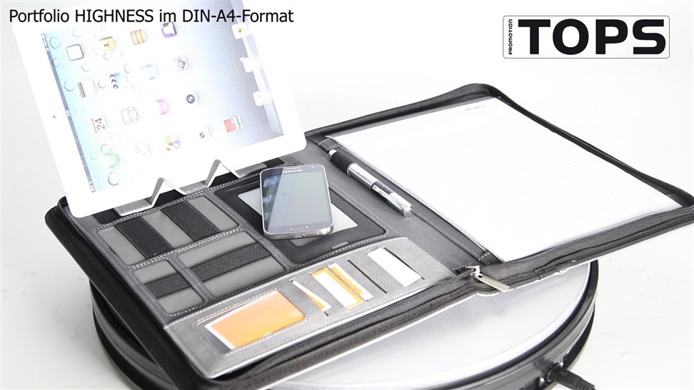 DIN A4 size: with built-in powerbank, large pocket for folders and documents, small pocket for a smartphone, display stand can be set up in various positions, elastic bands for stowage and organizing, various pockets for business cards, loop for a pen...