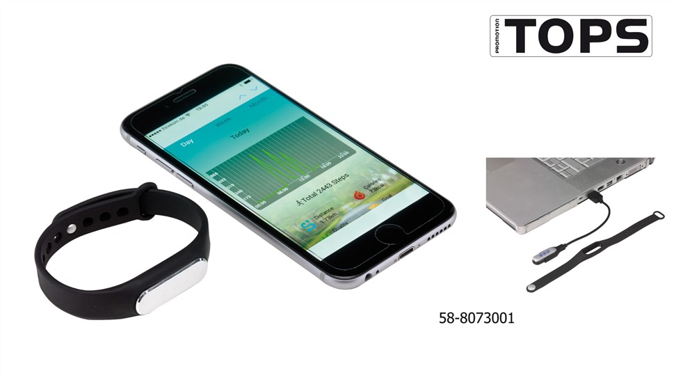 with pedometer, distance meter, calorie counter, sleep analysis and alarm via app with vibration alert for calls, SMS and alarm, data is synchronized with app via Bluetooth, removable tracker with integrated, splashproof, runtime: approx. 3 days...