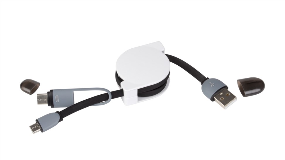 for charging of electronic devices, also suitable for data transfer, USB adaptor to Type-C and Micro-USB adaptors (extendible), with cable reel (approx. 103 cm)