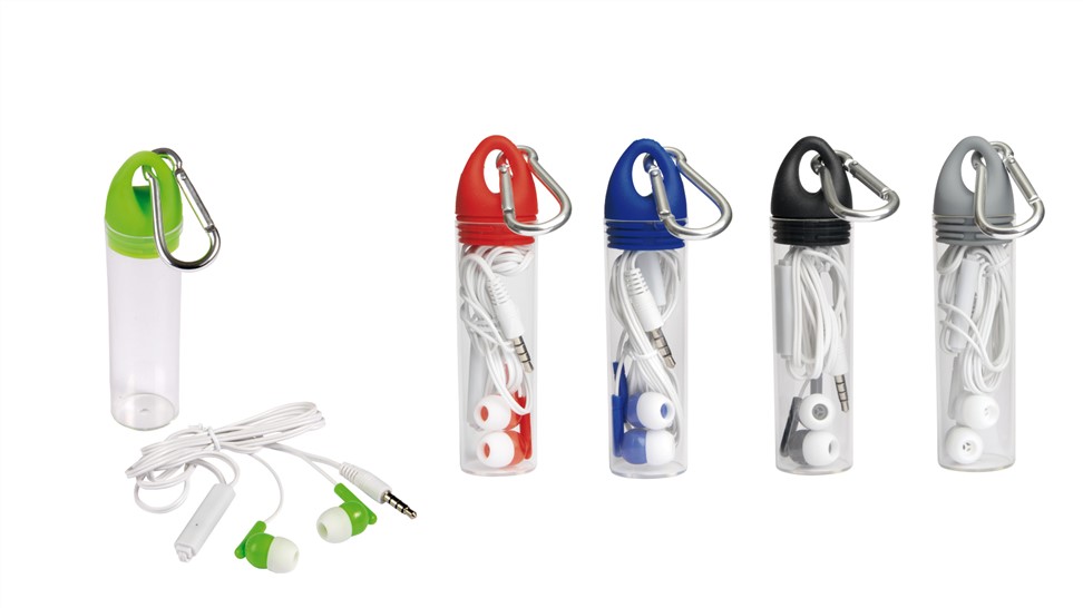 with integrated microphone and button for taking calls, 3,5 mm phone jack, wire length approx. 120 cm, in a plastic case with matching coloured cap and aluminium snap hook