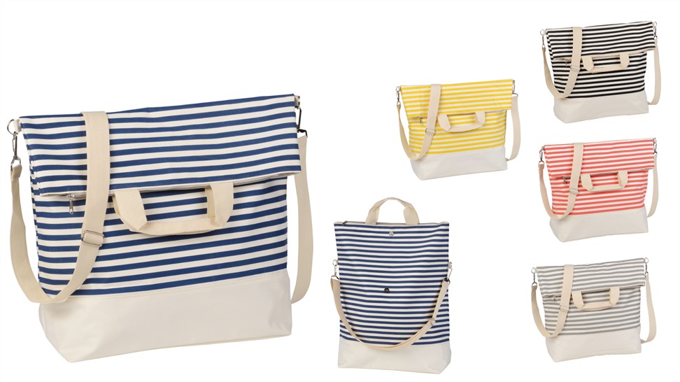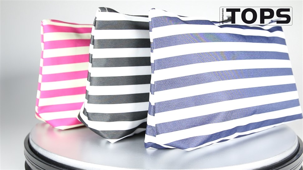 main compartment with zipper, small zipped pocket inside, cosmetic bag outside in maritime stripes and with leatherette patch on the front for placement of advertisement – ideal for cosmetics and beauty products